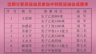 沈陽計算所選派的7名運動員經(jīng)過多日的刻苦訓(xùn)練、奮力拼搏,代表沈陽分院參加了中國科學(xué)院第五屆暨京區(qū)第十三屆職工田徑運動會。