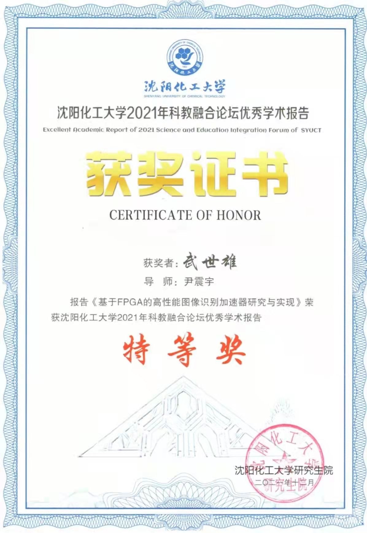 12月3日,沈陽化工大學(xué)舉行研究生教育會(huì)議,會(huì)議宣讀了2021年科教融合論壇研究生優(yōu)秀學(xué)術(shù)報(bào)告獲獎(jiǎng)名單,沈陽計(jì)算與沈陽化工大學(xué)聯(lián)合培養(yǎng)研究生武世雄的報(bào)告“基于FPGA的高性能圖像識(shí)別加速器研究與實(shí)現(xiàn)”(導(dǎo)師:尹震宇)從各學(xué)院選拔的49名優(yōu)秀研究生報(bào)告中脫穎而出,榮獲特等獎(jiǎng)。